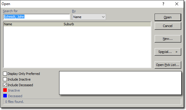 Enter the new patient's name in the Patient field of the New Appointment Wizard and press the Tab key. The Open window appears.